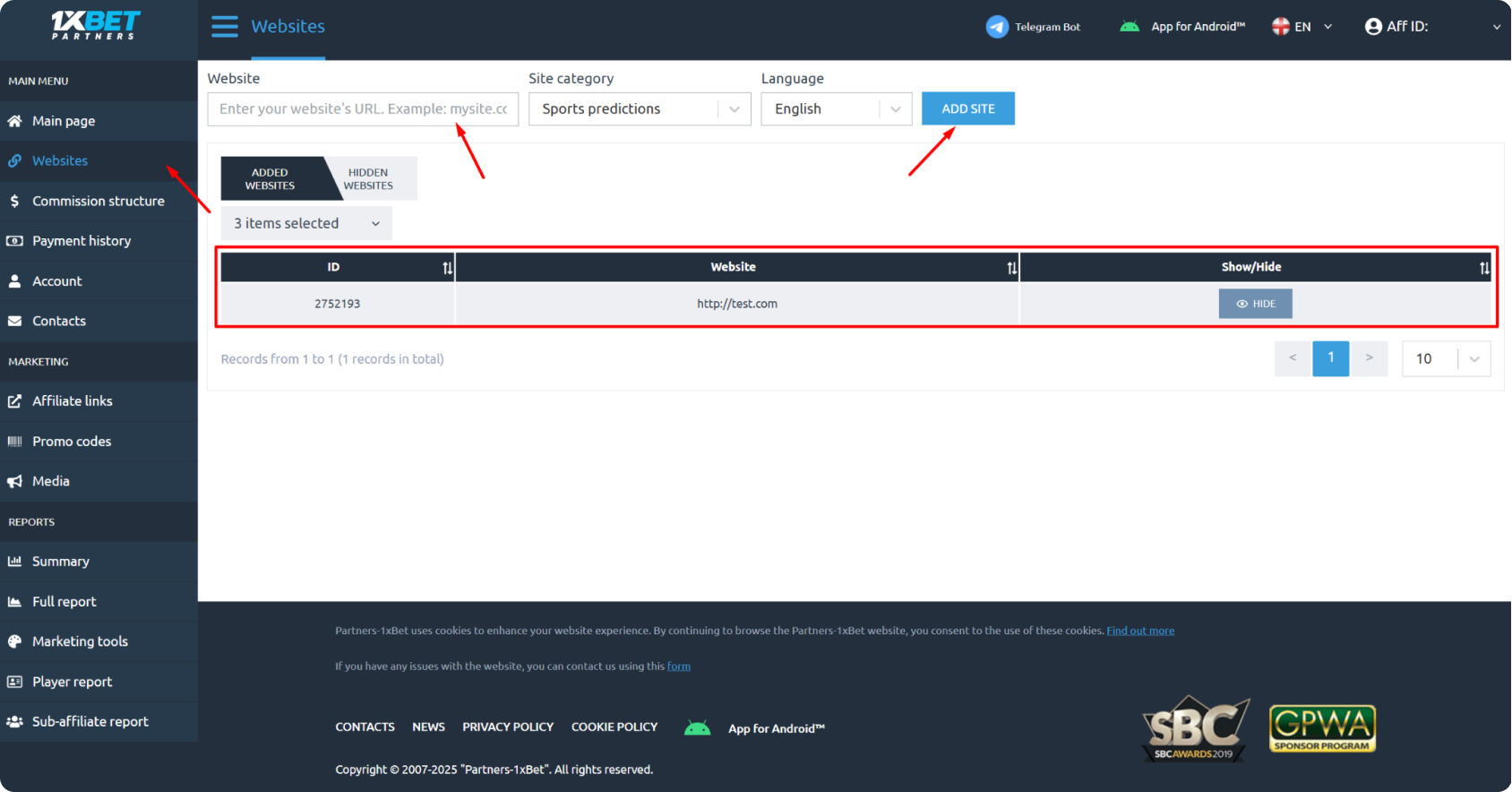 Həqiqi trafikin təmin edilməsi əməkdaşlıq üçün bir şərtdir. Resurslarınızı (veb saytlarınızı) təyin etmək üçün “Saytı əlavə et” bölməsinə getməli, bütün tələb olunan sahələri doldurmalı və «Əlavə et» düyməsini basmalısınız. Bundan sonra saytlar siyahıda, eləcə də yarandıqdan sonra müvafiq sahədə görünəcəkdir. Bu, oyunçuların trafikinin haradan gəldiyini görmək və 1xBet -i tanıtmaq üçün qadağan edilmiş trafik mənbələrindən istifadə etməməyinizə əmin olmaq üçün lazımdır. Ayrıca, fərqli istinad bağlantıları yaratmağa və trafikin effektivliyini daha da izləməyə imkan verəcəkdir.